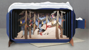 A precious winter scene featuring a scarf clad polar bear and a rabbit friend sharing a hot chocolate on a crisp winter day. This pop up card unfolds to stand up by itself. White envelope included.