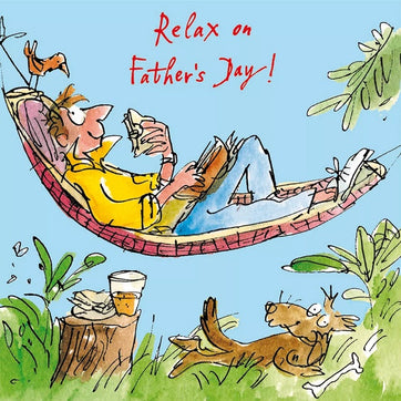 Relax on Father's Day. Let him know it's time to relax in the garden. This Quentin Blake illustrated Father's Day card is printed on forest friendly card, has the message Happy Father's Day inside and comes with a quality blue envelope.