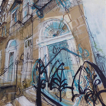 This card features railings in the West End of Edinbugh. This card has been made from Lucy Jone's original artworks in mixed media with collage. This card has been left blank inside for a personal message and it comes with a brown envelope.