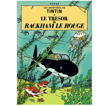 This playful Tintin poster features the original French cover of Red Rackham's Treasure, Le Trésor de Rackham le Rouge, designed by Herge. Tintin and Snowy explore the depths of the ocean in their brilliant shark submarine - it looks like fun! The poster comes rolled and unframed.