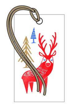 Brighten up your gift wrapping this Christmas with these fun die cut gift tags. A set of 4 tags, each featuring a woodblock deer and gold foil highlights, with red ribbon ties.