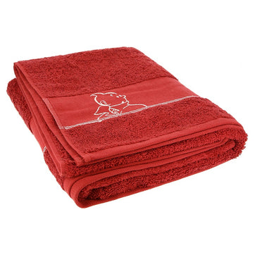 This high-quality bath towel comes in a bold red colour and features a brilliant embroidered Tintin illustration.