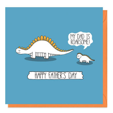 This is the perfect father's day card for your ROARSOME dad. A fun, illustrated Father's Day card featuring a daddy and baby dinosaur. The baby dinosaur is shouting 'My dad is Roarsome'.