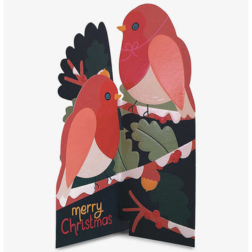 Send someone a perfect Christmas message in the perfect Christmas card this year, with this fantastic card featuring two Robins. When unfolded this card becomes a delightful free-standing scene (sure to stand out on the mantlepiece!).