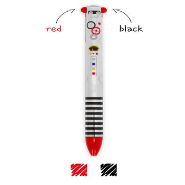 A two colour pen in black and red featuring a metalic robot motif, fantastic for duel purpose and a great addition to any pencil case!