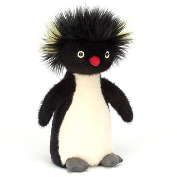 Ronnie Rockhopper may look like a kooky rock chick, but those wings were made for giving rocking hugs! A wild, fuzzy mane of black and yellow frames that bright little face, made up of bright eyes and teeny red beak. Soft, sooty fluff covers Ronnie from head to toe as he sits proudly upon a beany bottom.