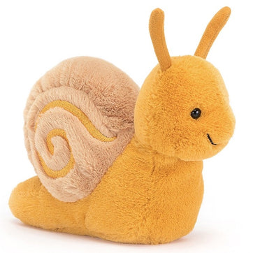 This Jellycat Sandy Snail wants to bring their home to yours. With its bright saffron fur, swirly brown shell and cute antennae, this snail is sure to quickly glide into your affections.