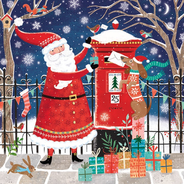 Santa is filling the local red postbox with cards and presents with the help of his animal friends. This Charity Christmas card pack is printed on 280gsm textured card, has the message "Wishing you a Merry Christmas and a Happy New Year" inside and comes with quality envelopes.