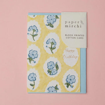 A cheerful block-printed birthday card, hand crafted in small batches by skilled artisans. Adorned with delicate blue flowers, it’s a bright and elegant way to celebrate someone special.