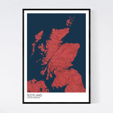 This quality art print of Scotland, with stylised text and white border, is printed onto uncoated 350gsm artist paper. This gives it an an artist-quality look and feel. We love this colourway, with rich navy blue and contrasting rich red.