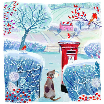 Capture the heartwarming sentiment of Christmas correspondence with this utterly captivating design. The scene features a loyal, patiently waiting dog ready to drop a special letter into a classic, bright red pillar box, all set against a whimsical, snow-covered country landscape. The folk-art inspired illustration is rich in detail and festive cheer: Spot the tiny robins perched on the post box and in the snow-dusted trees, Admire the rolling, snow-covered fields leading back to a charming, pink cottage, The vibrant colours—crisp blues and whites contrasted with striking reds—perfectly evoke the chilly beauty of a winter's day.