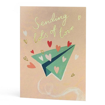 Sending lots of love. Let your love take flight this Valentine's day with this gold foiled paper aeroplane card. This Valentine's card is printed on luxury card and comes with a 100% recycled white envelope.
