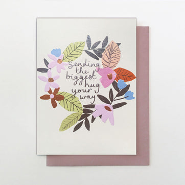 A pretty floral wreath card with the text 'sending the biggest hug your way', is a lovely way to send your love and support to your friends and family. Foiled and embossed it is printed on luxury Forest Friendly card alongside a dusky pink envelope.