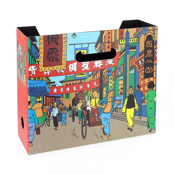 This colourful box file features an illustration from The Blue Lotus of Tintin and Snowy making their way through a busy Shanghai street in a rickshaw.