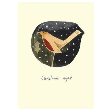 Christmas Night. A single robin redbreast sits in the snow on silent night. This Christmas card is illustrated by Anita Jeram, is blank inside and comes with a quality envelope.