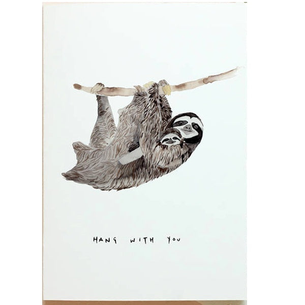 Hang with you sloth Mother's Day eco friendly card. This mother's day card is blank inside, printed onto ecological ‘tree free’ annually renewable plant fibre cream paper and comes with a gold foiled envelope, made from upcycled coffee cups.