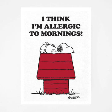 Adorably decorated with the Peanuts character, Snoopy, this tea towel reads the funny slogan, 'I Think I'm Allergic to Mornings'. Haven't we all felt that?