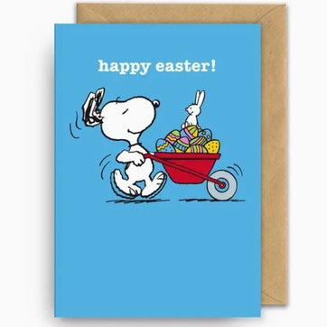 This adorable Snoopy Easter card is the perfect way to spread some springtime cheer! Snoopy is seen happily pushing a wheelbarrow filled with colorful Easter eggs, ready to deliver them to friends and family. This Snoopy Easter card is blank inside, comes with a quality brown envelope and is printed on forest friendly card.