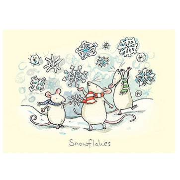 Snowflakes. Three cheery mice enjoy the snow. This Christmas card is illustrated by Anita Jeram, is blank inside and comes with a quality envelope.