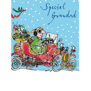 Special Grandad. This glitter varnished Christmas card of a grandfater in his vintage car is a great way to remind him how you feel. The card is on luxury card, has the message "Wishing you a Christmas as amazing as you are" inside, and comes with a quality envelope