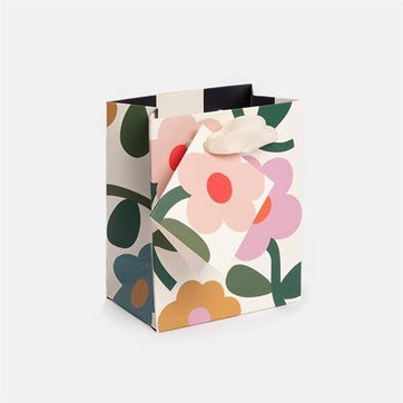This small gift bag is decorated with lovely, bold florals. In spring colours of blue, green, orange and pink, this simple design is the perfect finishing touch to any gift.