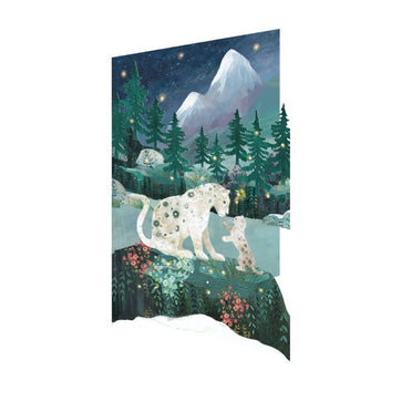 This card features a delightful illustration of a snow leopard playing with its cub under the starry night sky. It is also one of our laser-cut cards, so has a beautiful and delicate front that is sure to make this card stand out on the mantlepiece!
