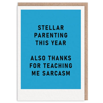 Stellar parenting this year. Also thanks for teaching me sarcasm. Let him know that you learned from the best. This black foil Father's Day card is blank inside, is printed on forest friendly card and comes with a quality brown kraft envelope.