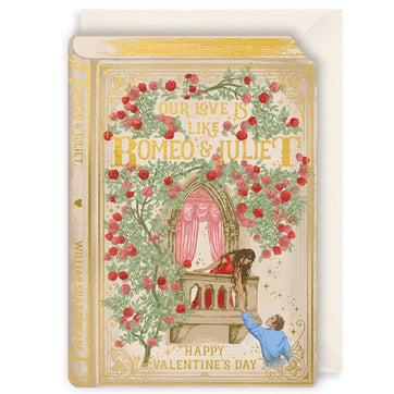 Designed to look like a vintage hardback book, the card features the iconic balcony scene from Shakespeare’s Romeo & Juliet. The intricate design is brought to life with delicate die-cut edges, embossing, and opulent gold foil detailing that catches the light. The front of the card bears the poetic sentiment: "Our love is like Romeo & Juliet", making it a thoughtful choice for a partner who appreciates timeless romance.
