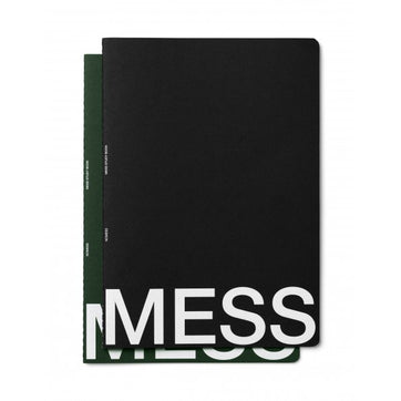 Colourful study books in black and green, with 'MESS' and 'NO' inscribed on the front and back respectively.