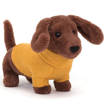 This Jellycat Yellow Sweater Sausage Dog is quite the dapper dachshund. With its cute mustard roll-neck, long floppy ears and tiny tail this happy dog is ready for walkies. This soft and squishy sausage dog is dressed in the cutest yellow sweater, perfect for snuggling up with on chilly days.