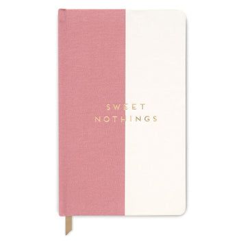 This striking notebook features a half cloth and half paper cover in pink and white, with 'sweet nothings' in gold foil. A perfect place for your notes and journaling. Inside there are 240 lined pages with matching ribbon marker.