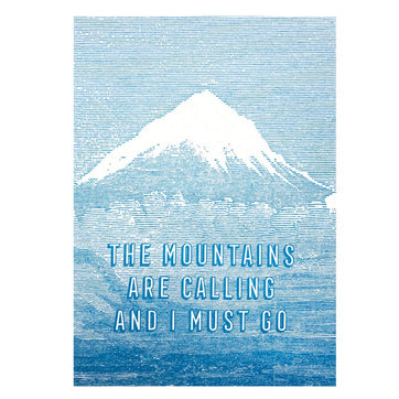 This card has been hand printed by Rhian Nicholas of The Passenger Press on an antique letterpress in her studio in Glasgow. Taking inspiration from Archive Colllections and stately homes from around the country this card is part of the Hearth and Home collection and illustrates the famous John Muir quote The mountains are calling and I must go'. Printed in blue ink.