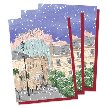 Wish your family and friends a Merry Christmas from the Vennel steps in Edinburgh with this pack of 5 Christmas cards. The deisgn features a view down the Vennel steps looking at Edinburgh Castle. The cards are printed on high quality card, are blank inside for your own festive message, and come with a red envelope.