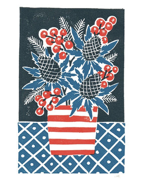 Creator of fine illustrations, designs, and patterns, artist Sophie Elm has created a holiday floral card complete with festive thistles and berries. Illustration on paper with compostable cello.