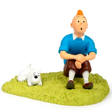 This hand painted resin figurine of Tintin and sleeping Snowy sitting in the grass is from a scene in the Tintin adventure The Black Island. It comes with a numbered certificate of authenticity and presented in a display box.
