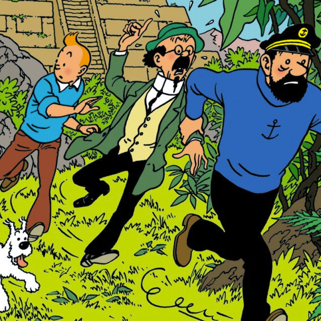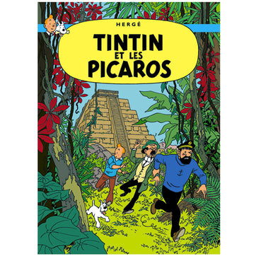This brilliant Tintin poster features the original French cover of Tintin and the Picaros, Tintin et les picaros, designed by Herge. Tintin and his team run away from an ancient temple into the jungle - run fast, Snowy! The poster comes rolled and unframed.