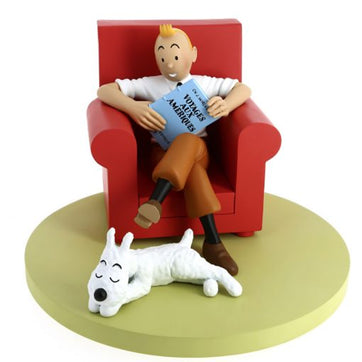 This limited edition resin model depicts a cozy Tintin relaxing in his armchair, with his loyal companion Snowy sleeping peacefully at his feet. Tintin looks very dapper in his shirt and tie as he gazes fondly at his fluffy friend. This scene comes from Tintin's adventure 'The Broken Ear'.