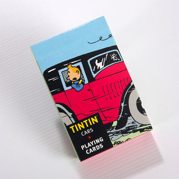 A set of playing cards using the images of characters in cars from the Tintin adventures.