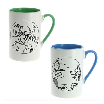 Set of two mugs, one with Tintin carrying a camera rom Tintin in the Congo with Snowy on back of mug as you hold it. Images on white matt background with a green interior and handle.
