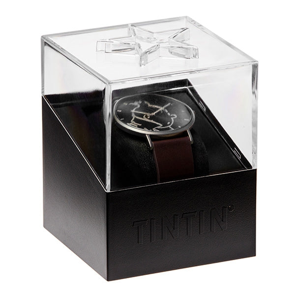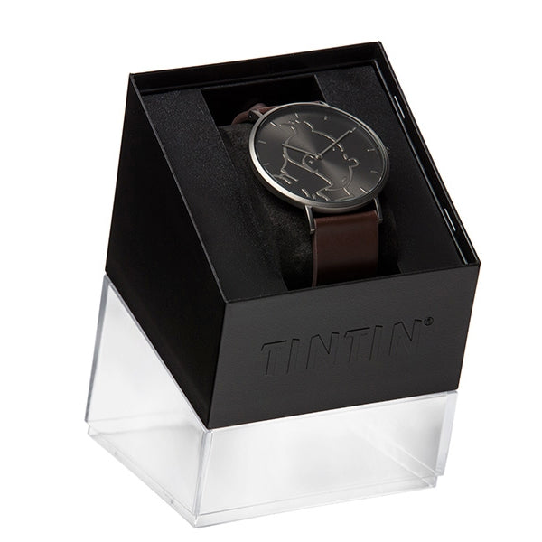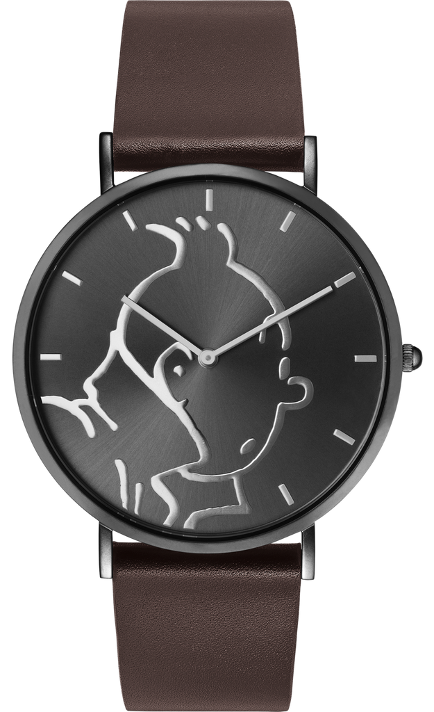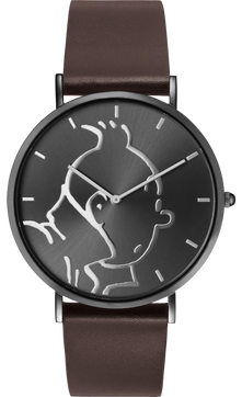 Tintin has never looked classier than on this stunning embossed anthracite coloured metal watch face, with coordinating brown strap.