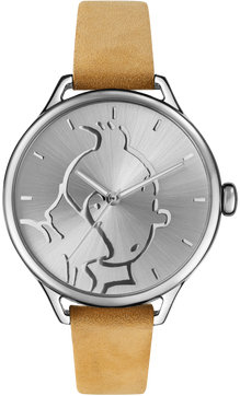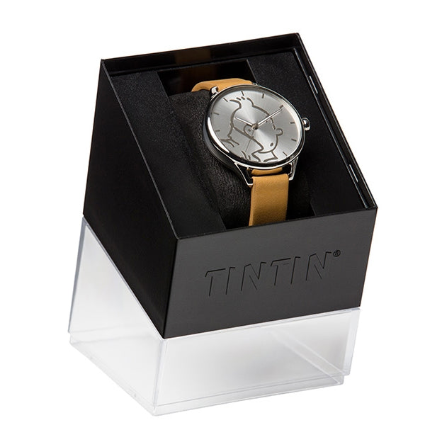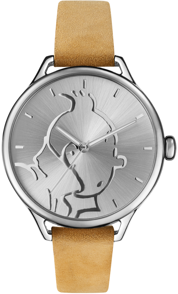 Tintin has never looked more sophisticated than on this minimalist embossed watch face with classic camel strap.