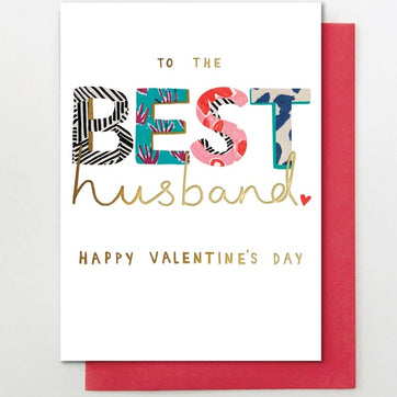 This cheerful Valentine's Day card reads 'to the best husband, happy Valentine's Day' with gold foil details. Blank inside.