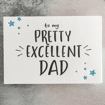 To My Pretty Excellent Dad. A letterpressed Father's day card to tell him just how you feel about him. This cars is blank inside and comes with a kraft brown envelope.