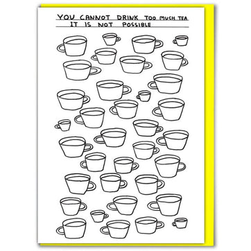 You cannot drink too much tea. It is not possible. Help raise a smile with this David Shrigley tea-riffic illustration. This quirky card is printed on forest friendly card, is blank inside and comes with a quality yellow envelope.