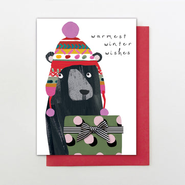 Nothing says Christmas more than a bear, carrying a present, wearing a woolly hat with a pompom on top! Printed on luxurious board, this card is embellished with a black and white stripy bow for added fun. Cello wrapped, it comes with a bright red envelope.