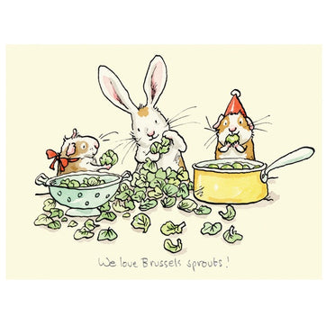 This delightful single card features the whimsical and beloved artwork of Anita Jeram, the illustrator famous for the classic children's book, Guess How Much I Love You. The design is a charming and slightly cheeky nod to the controversial festive vegetable. It features two of her signature animal characters gazing adoringly at a pile of green goodness, confidently declaring, "We Love Brussels Sprouts."