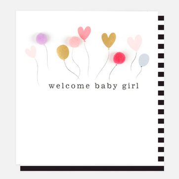 Welcome a little one into the world with this cute balloon welcome baby girl card, featuring gold foil and mini pom-poms for that extra special touch.