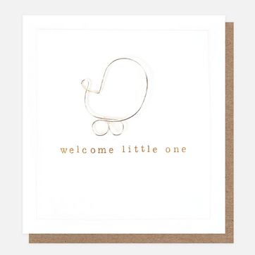 This wonderful wire pram card is ideal for celebrating the arrival of a little baby boy or girl. Made with shaped wire and with gold foil embossed lettering this card really is a little bit special.
