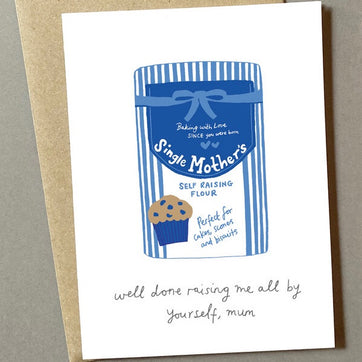 Well done on raising me all by yourself mum. This self raising mother's day card is blank inside, is printed on Forest Friendly approved card and comes with a quality kraft envelope.
