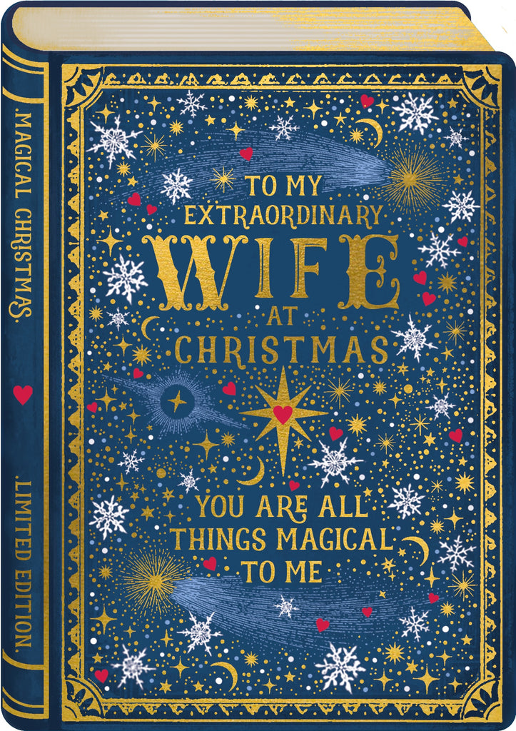 Show your wife how much she means to you this Christmas with this beautiful Wife at Christmas Storybook Card. This card is sure to make her feel special with a magical design of a wintery starry night, complete with gold foil details and the message "To my extraordinary wife at Christmas, you are all things magical to me." This card is blank inside for you to add your own personalised message of Christmas best wishes.